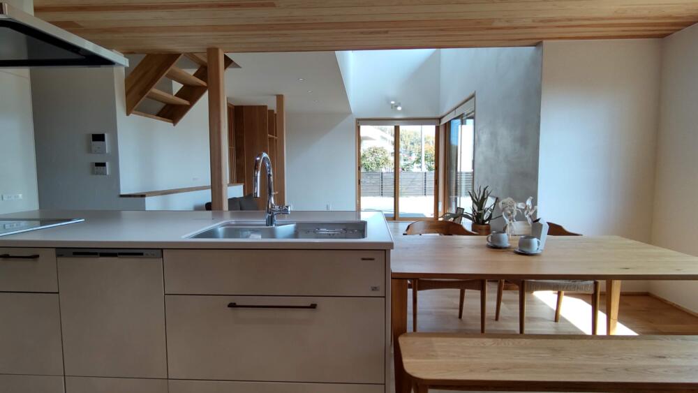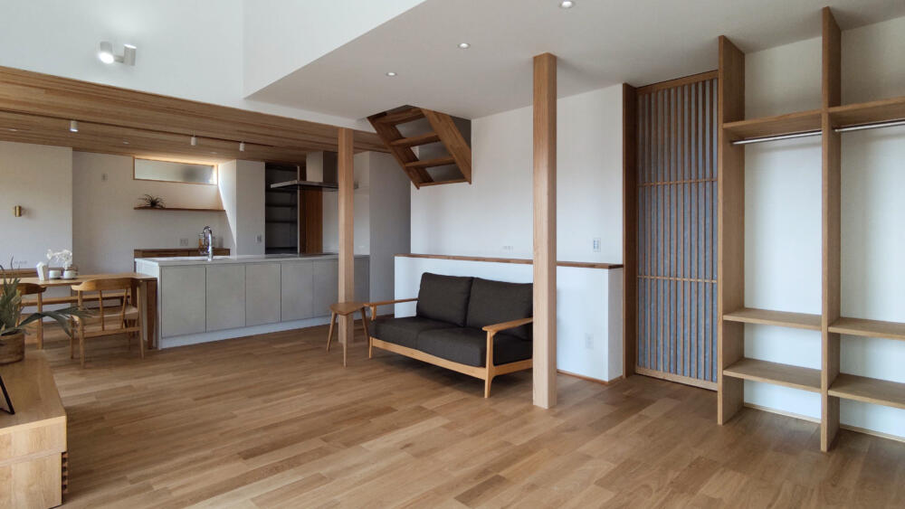 吹き抜けから光が注ぎ、家族の時間を明るく照らします。