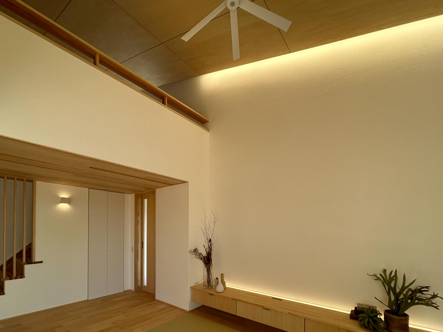 ・漆喰や無垢材などの自然素材を使用し、調湿性や断熱性を高めることで、四季を通じて快適な環境を実現。深い軒が夏の日差しを遮り、冬の暖かい光を取り込むパッシブデザインです。