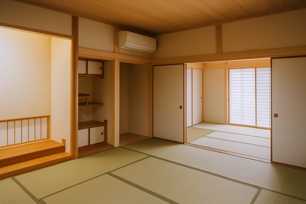 い草の香りが落ち着く二間続きの和室は、客間にも家族の団らんの場にもなる多用途な空間。