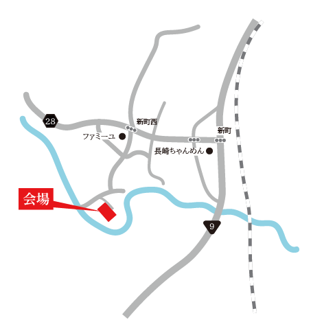 ファミーユさん(パン屋)のある信号「新町西」を曲がり、道なりにまっすぐ進んでいただき、