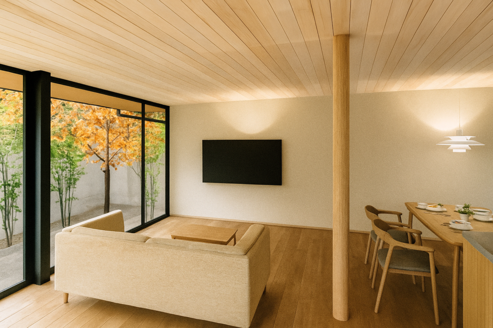 カーテンのいらない解放感と、包まれるような安心感が共存する空間。