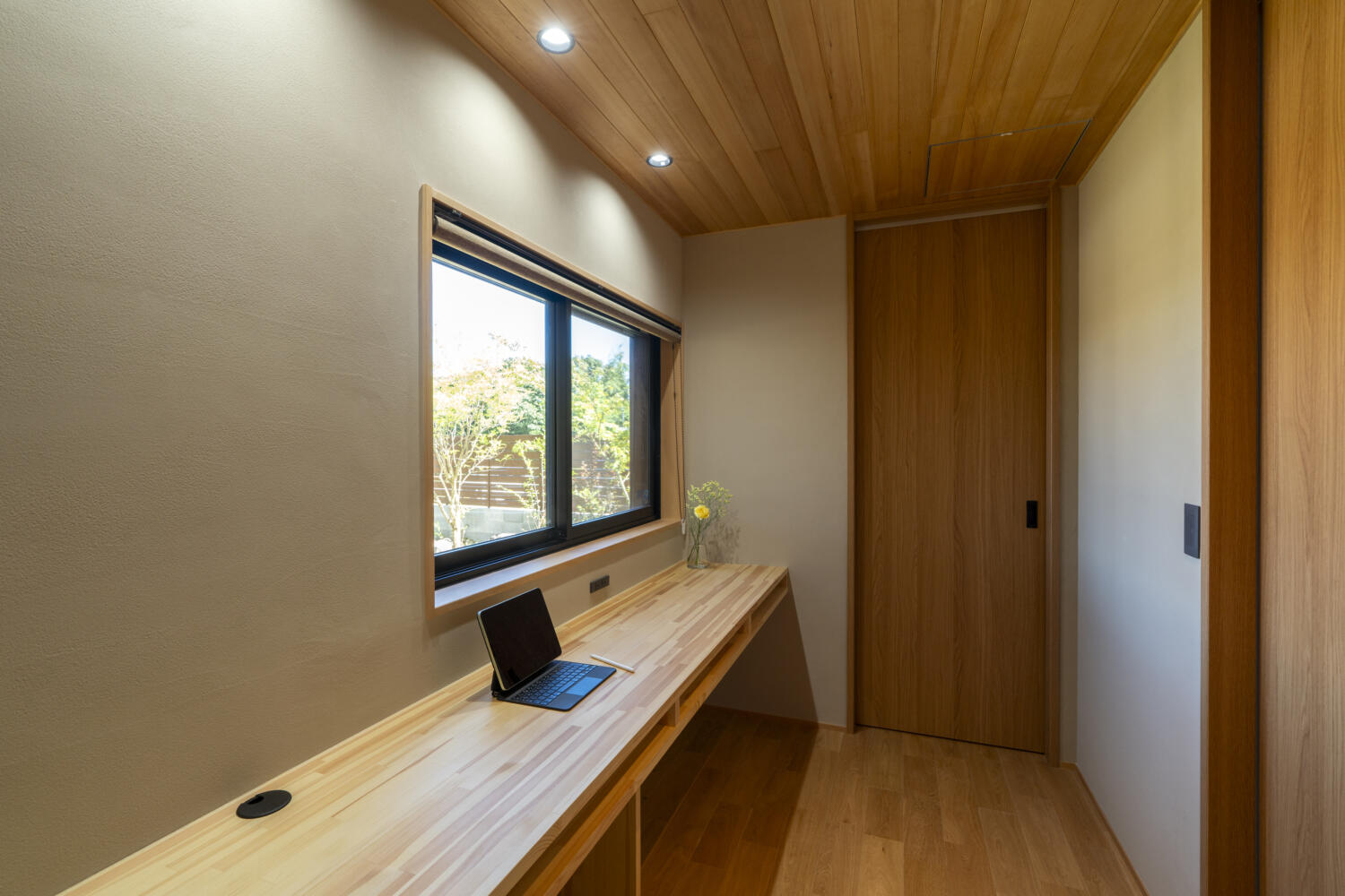 天井の梁や窓の木枠が、空間にやさしい印象を与える寝室・個室エリア。