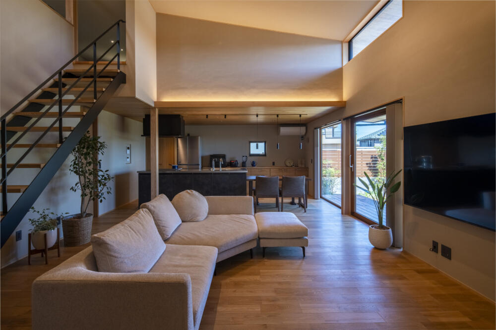高天井と大きな窓、光を引き込む設計。自然と会話が生まれる、心地よい空間です。