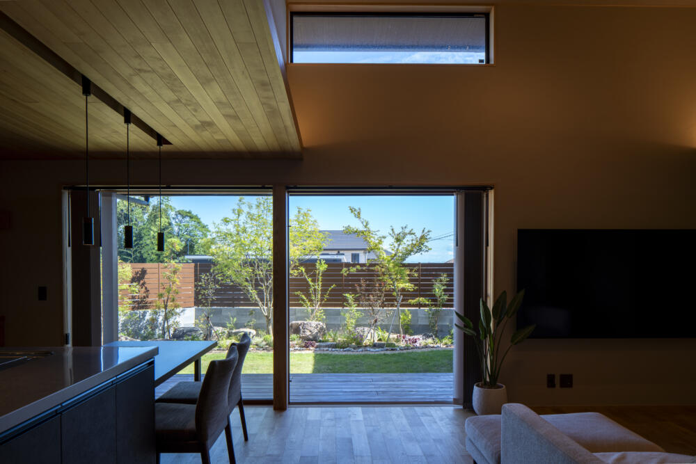 外には深い軒に守られたウッドデッキと庭があり、L字型の配置が道路からの視線をやさしく遮って、家族の時間を静かに包み込みます。