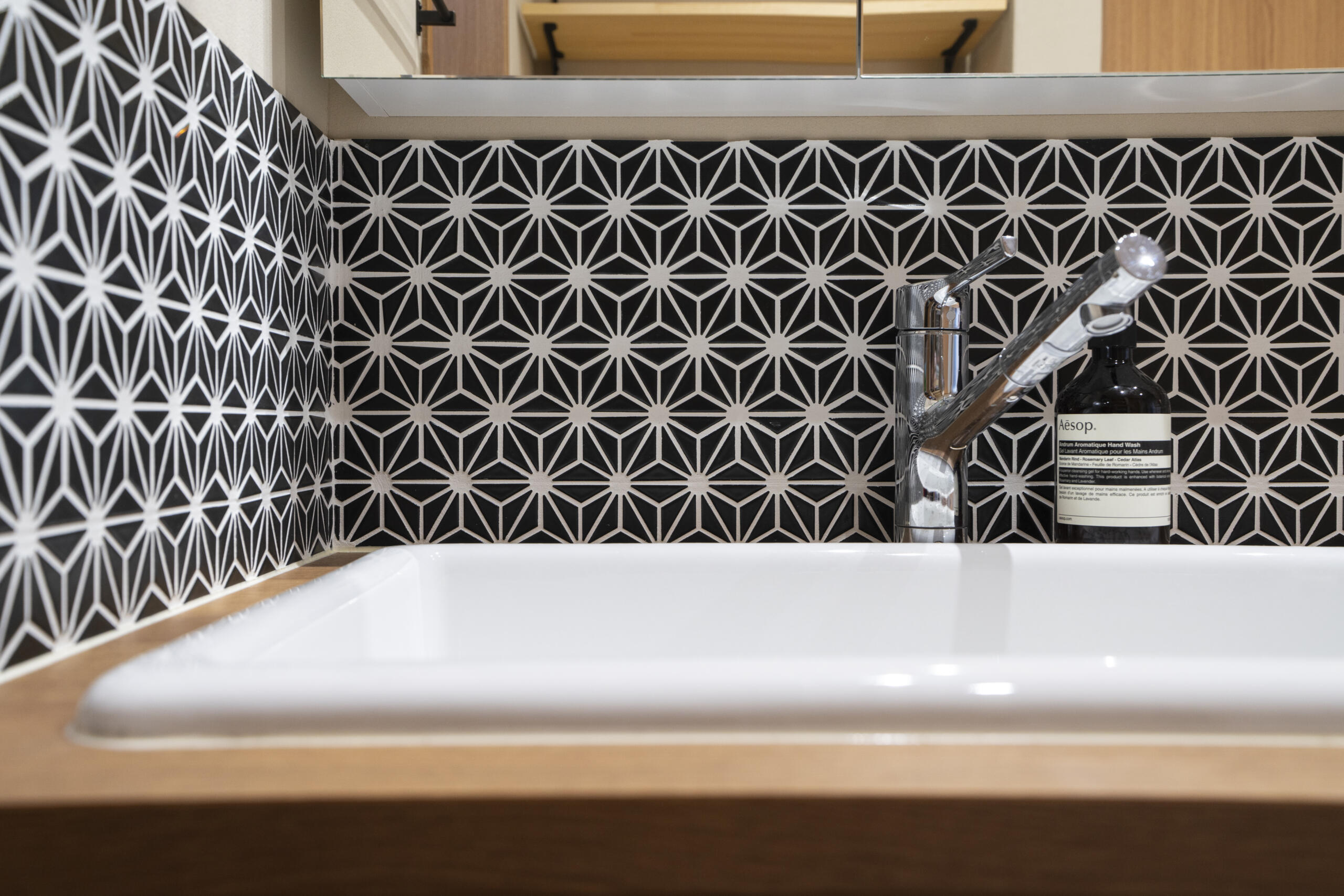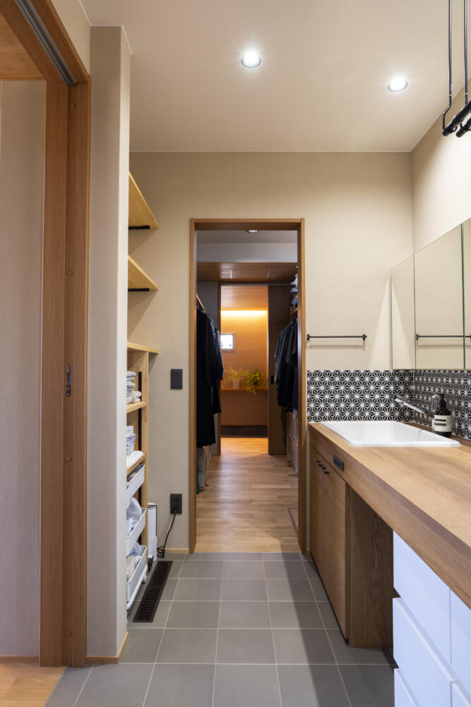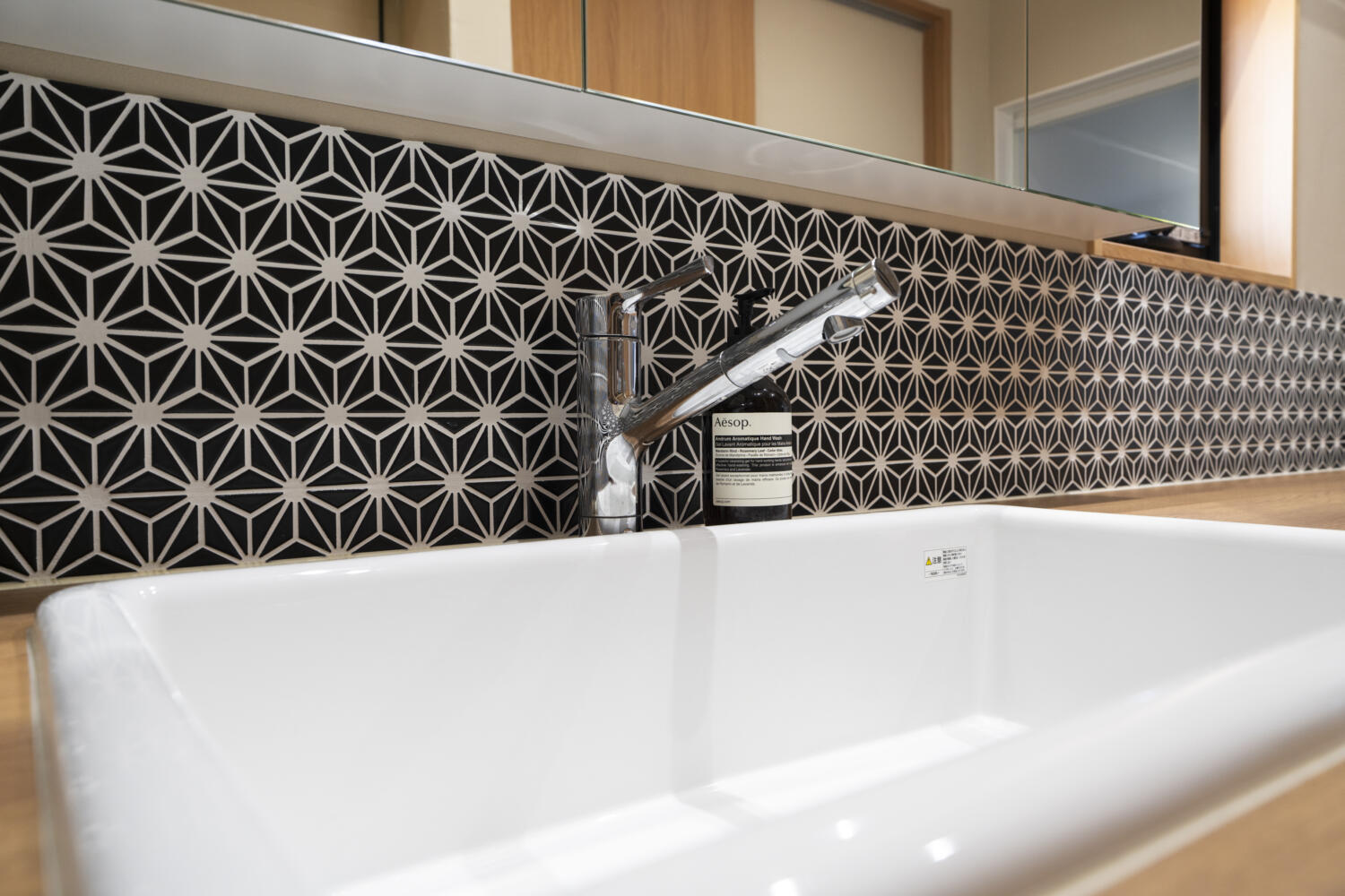 また、洗面には伝統柄をモダンにアレンジしたタイルをあしらい、機能性とデザイン性を両立。