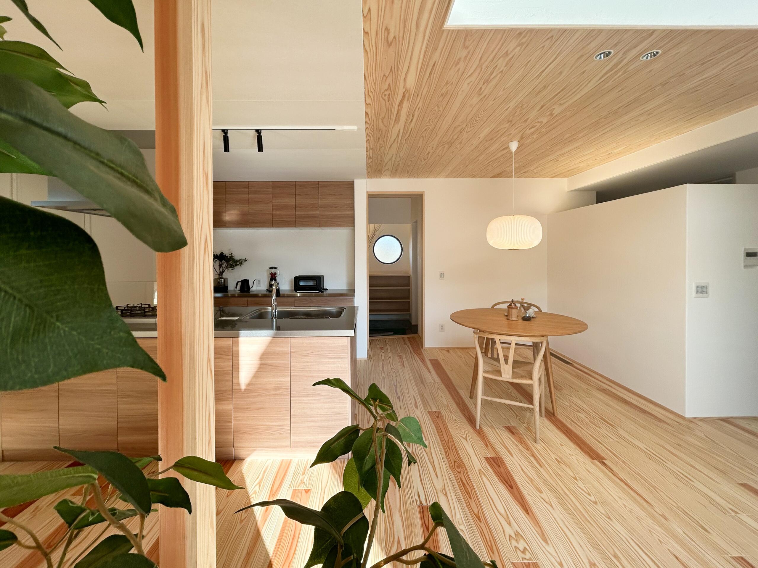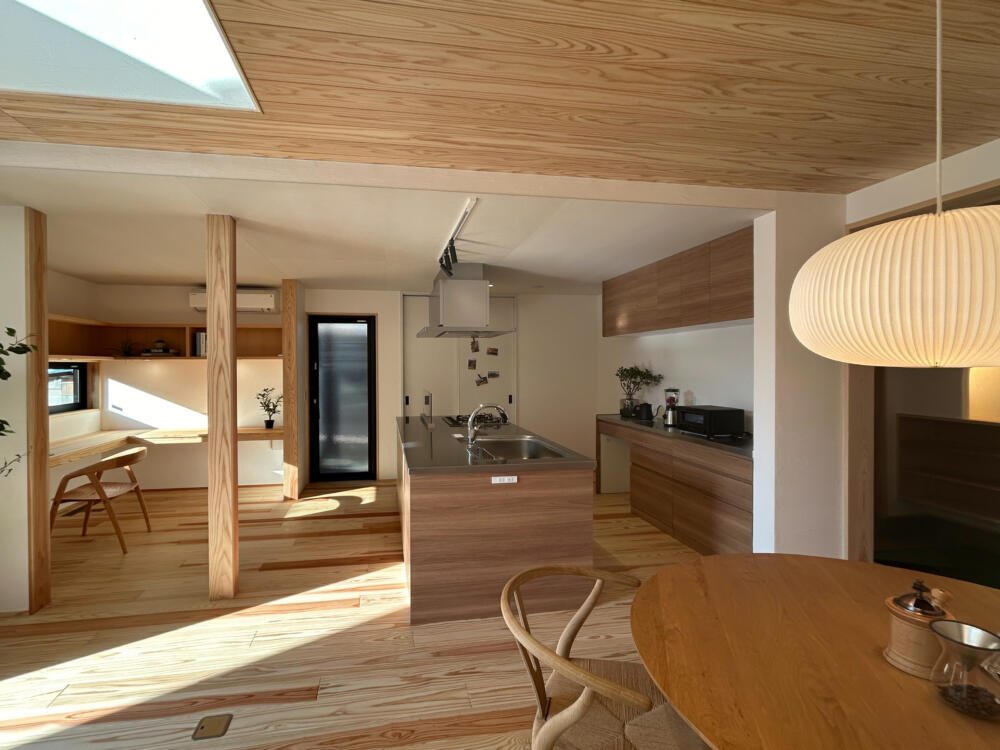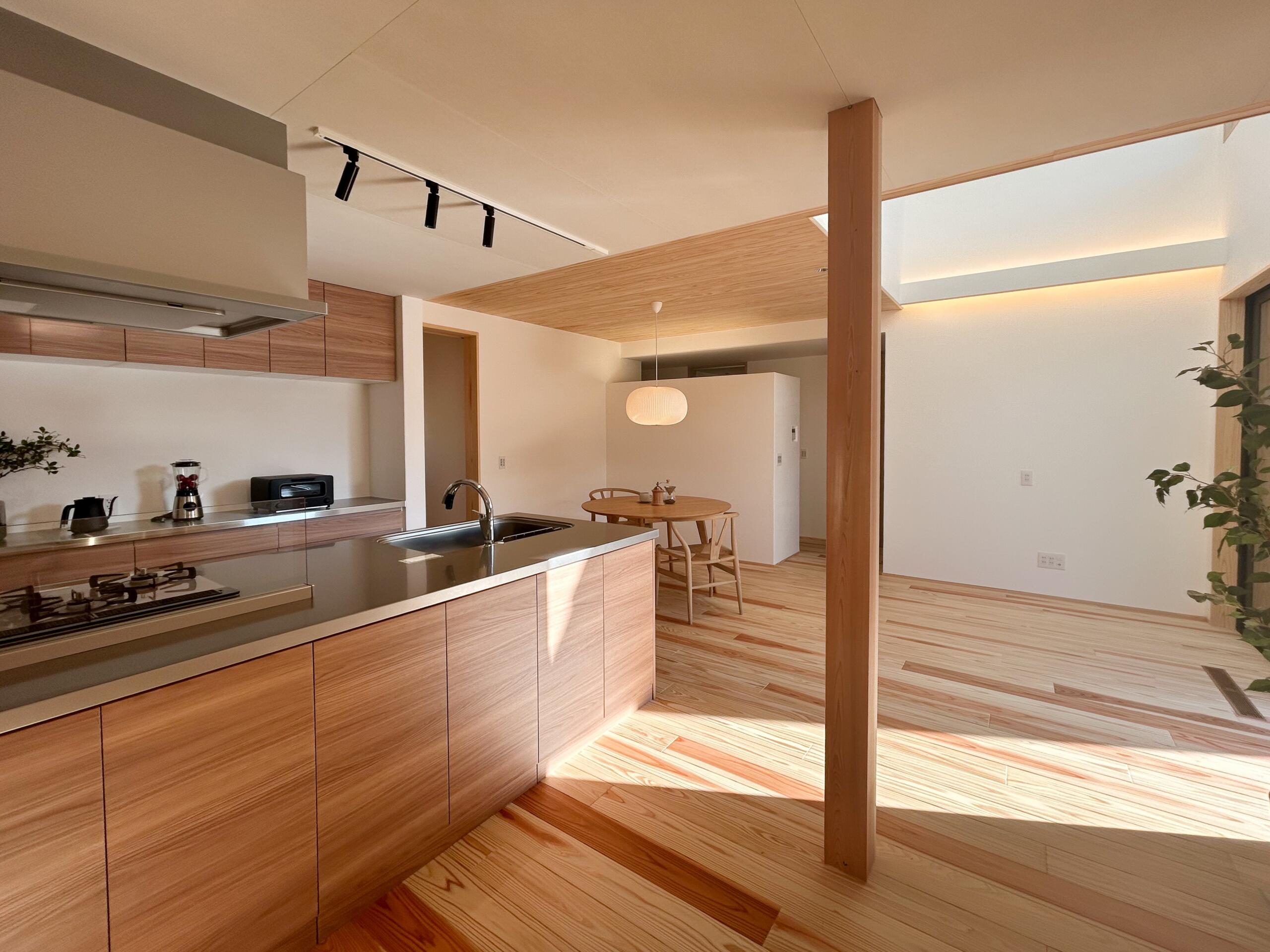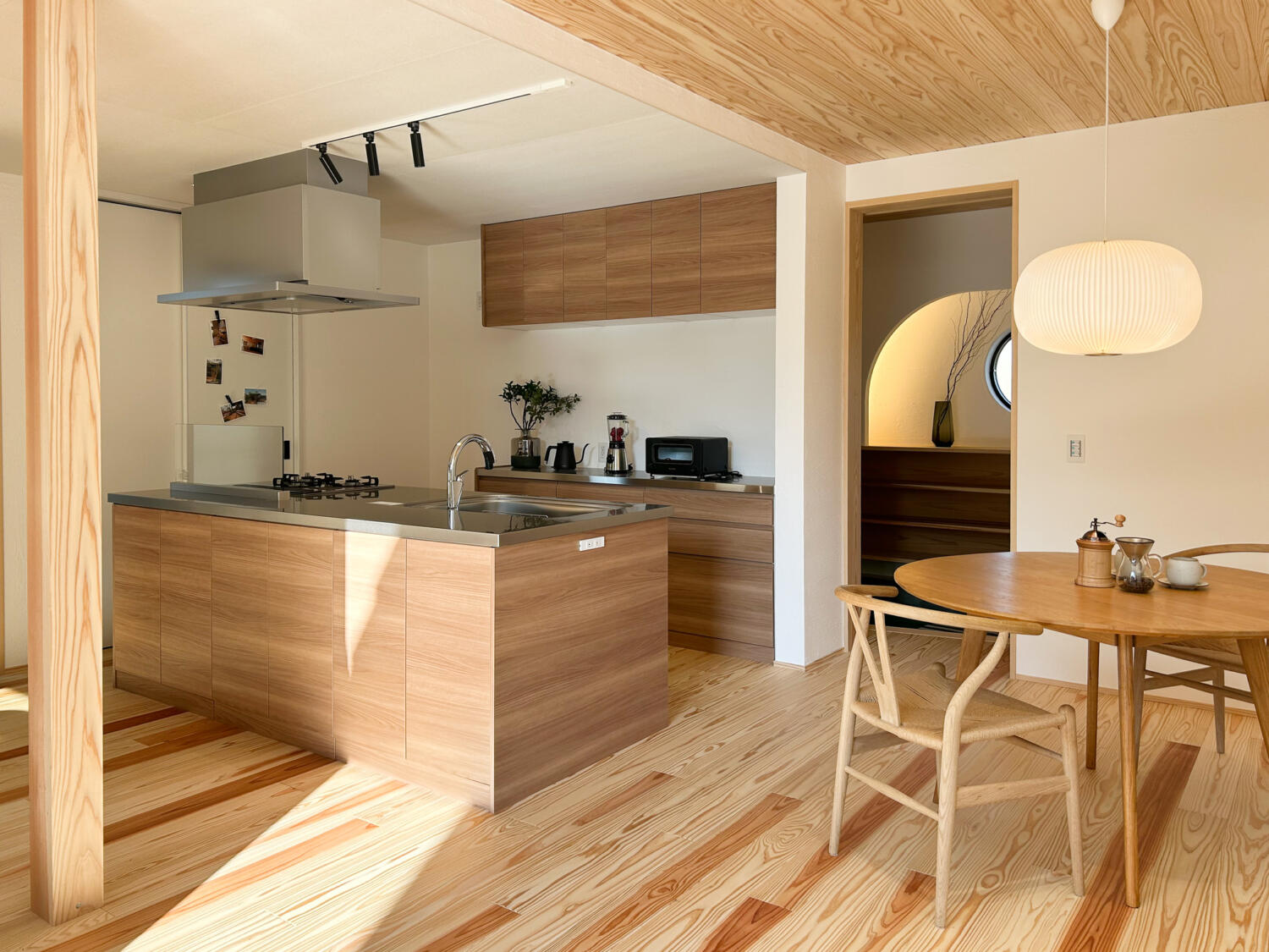 木の質感が心地よく広がるキッチンとダイニングは、家の中心として家族の時間を育んでいく場所です。