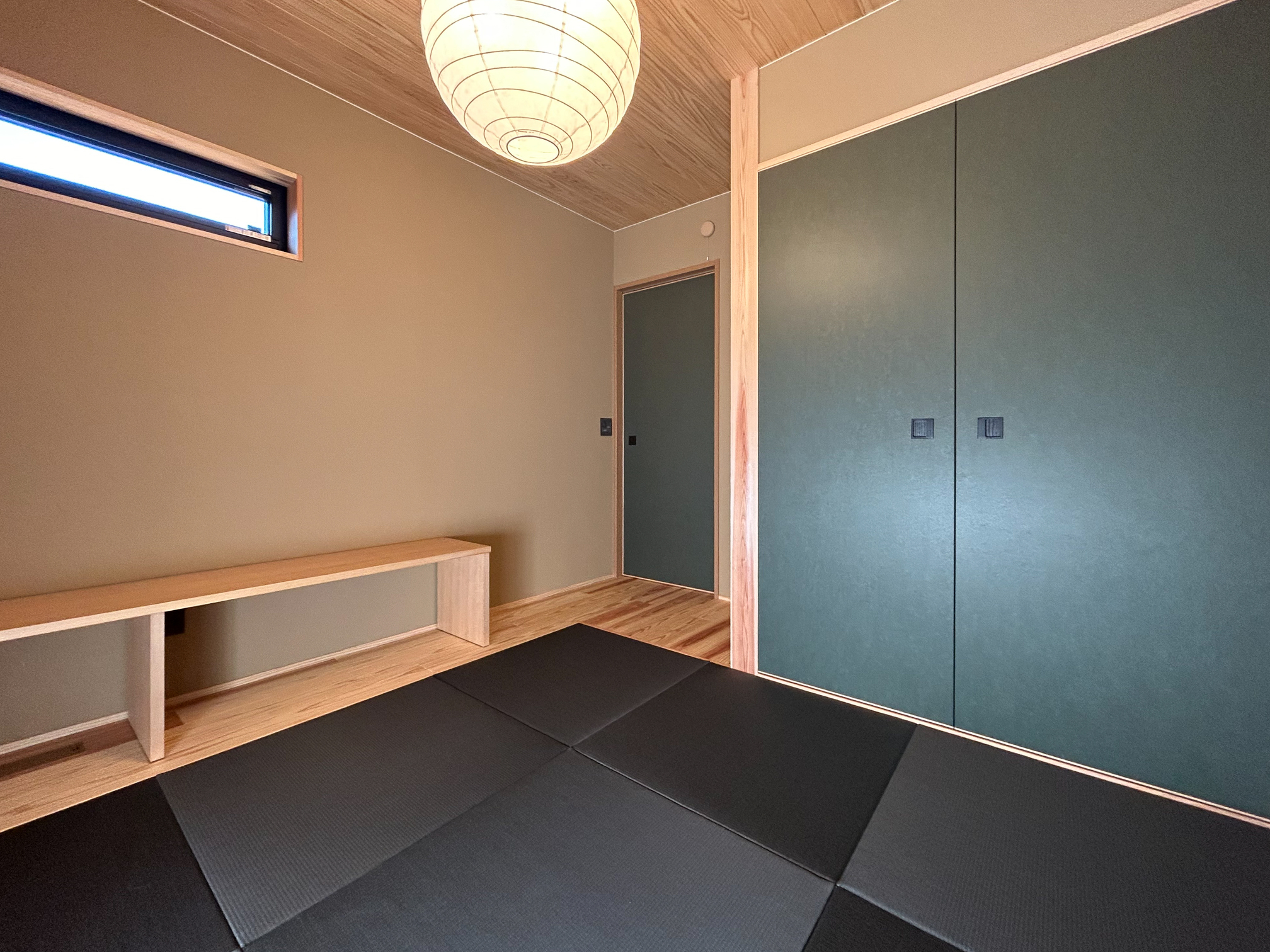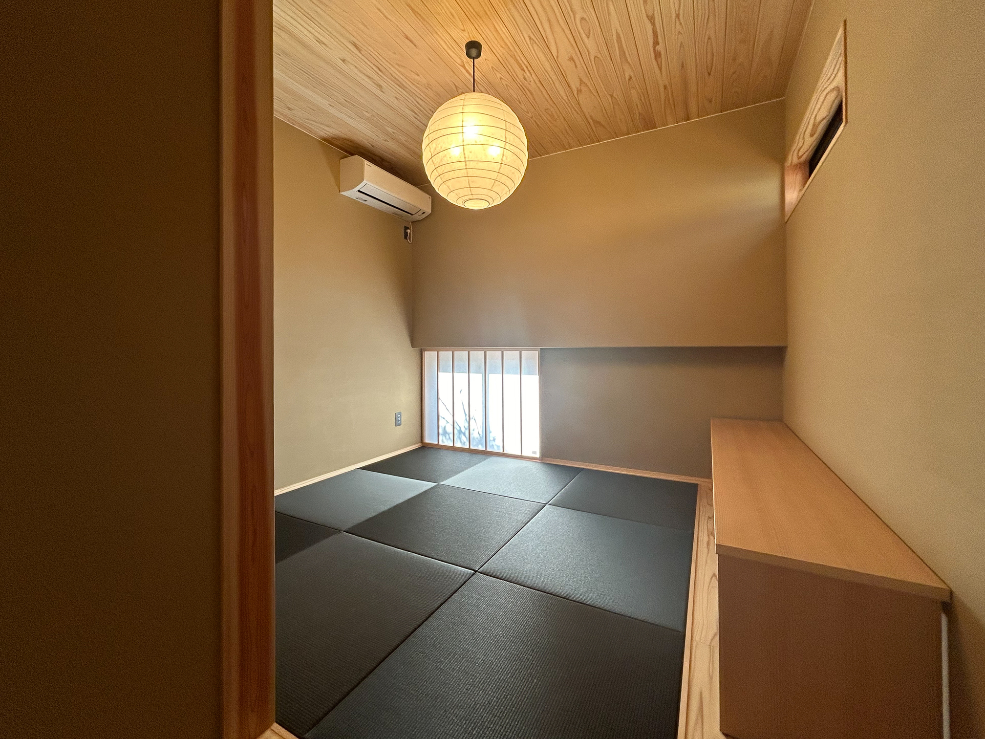 深い色合いの畳が静かな存在感を放つ和室は、日常の喧騒からふっと離れられるような落ち着きに満ちています。