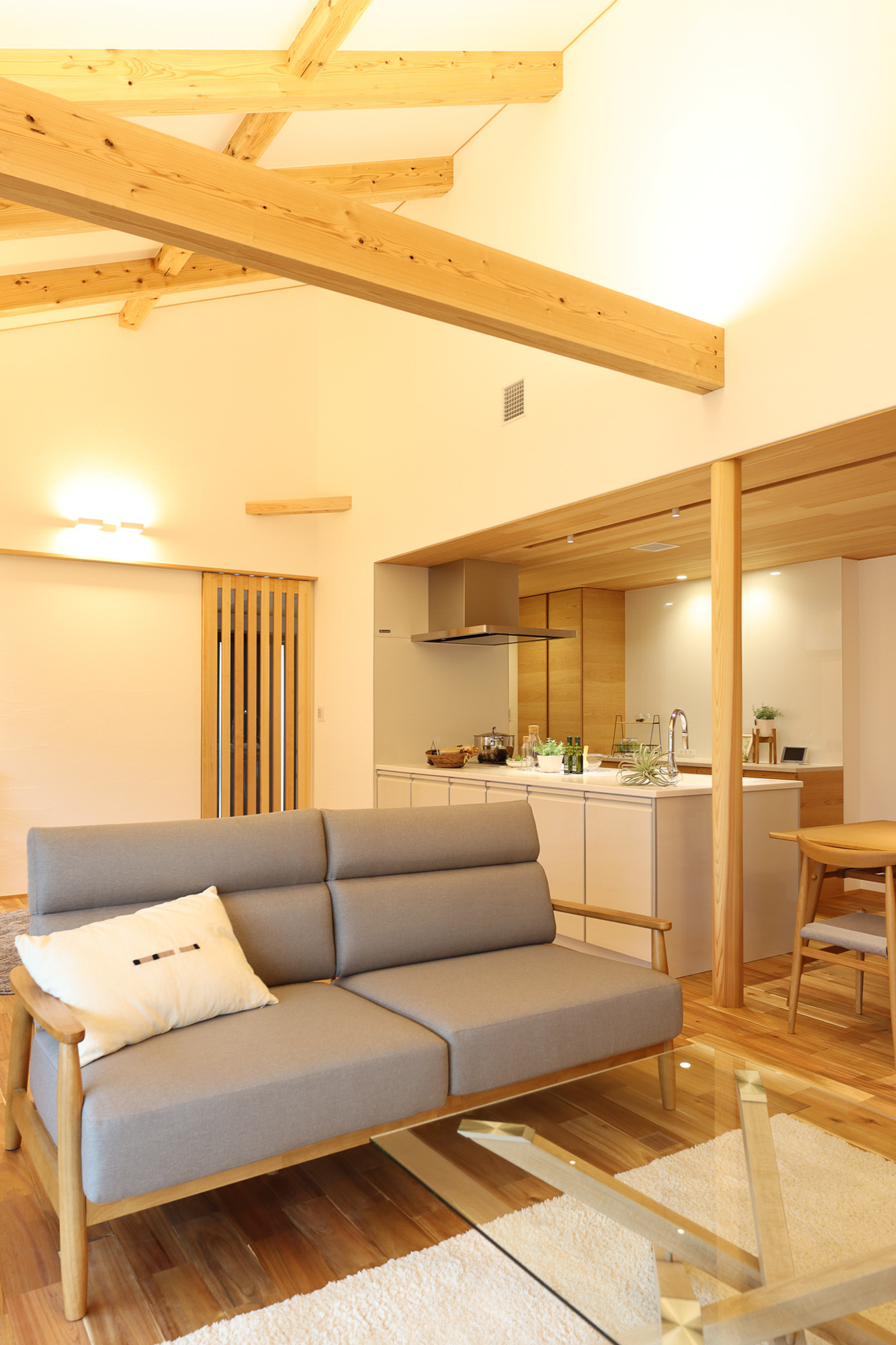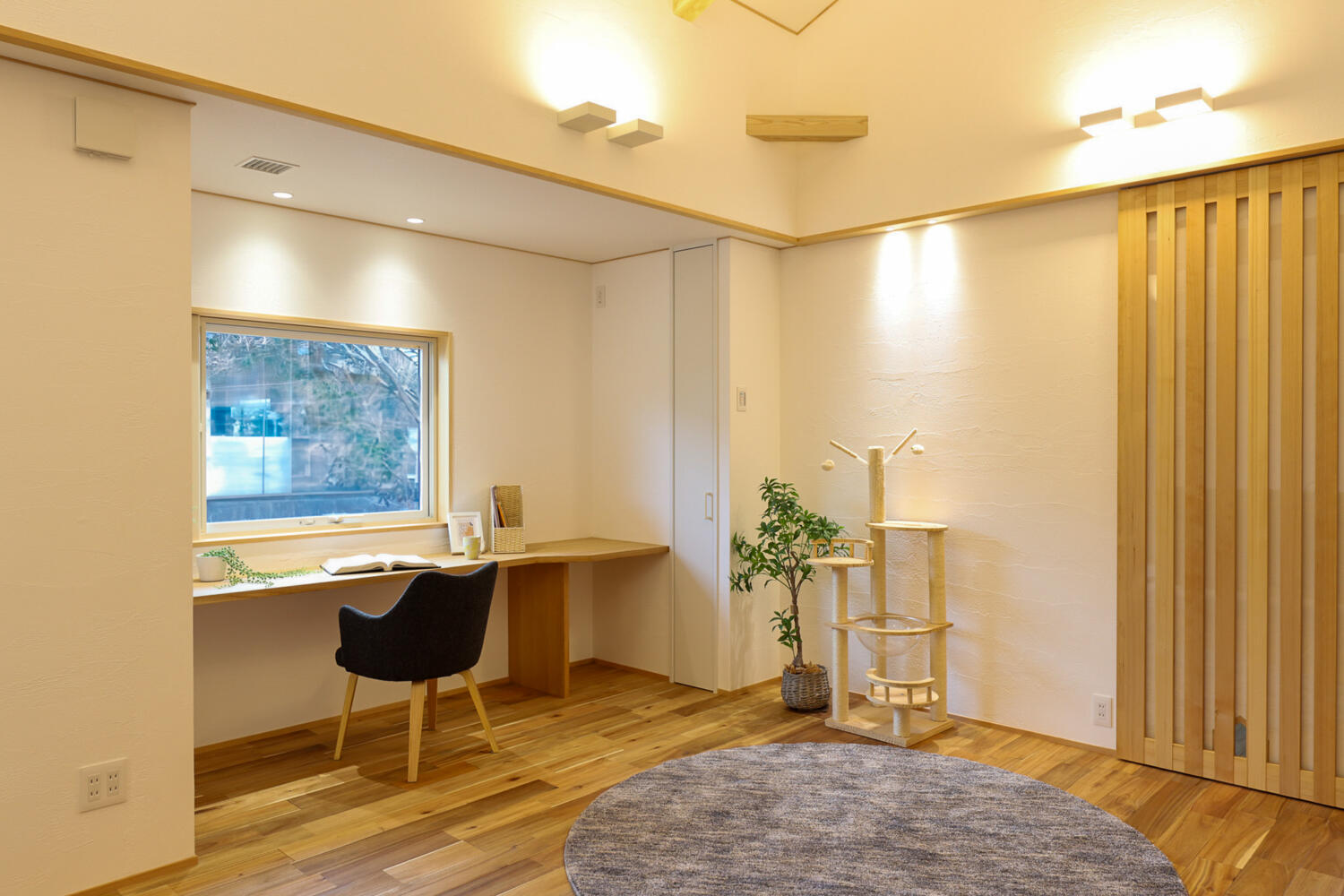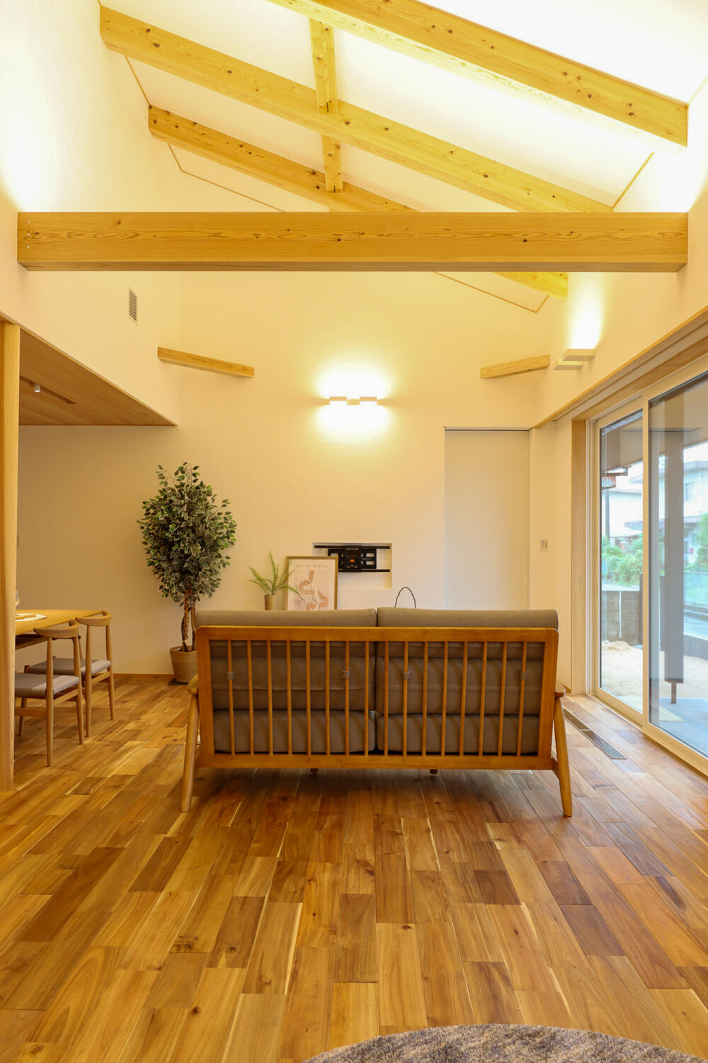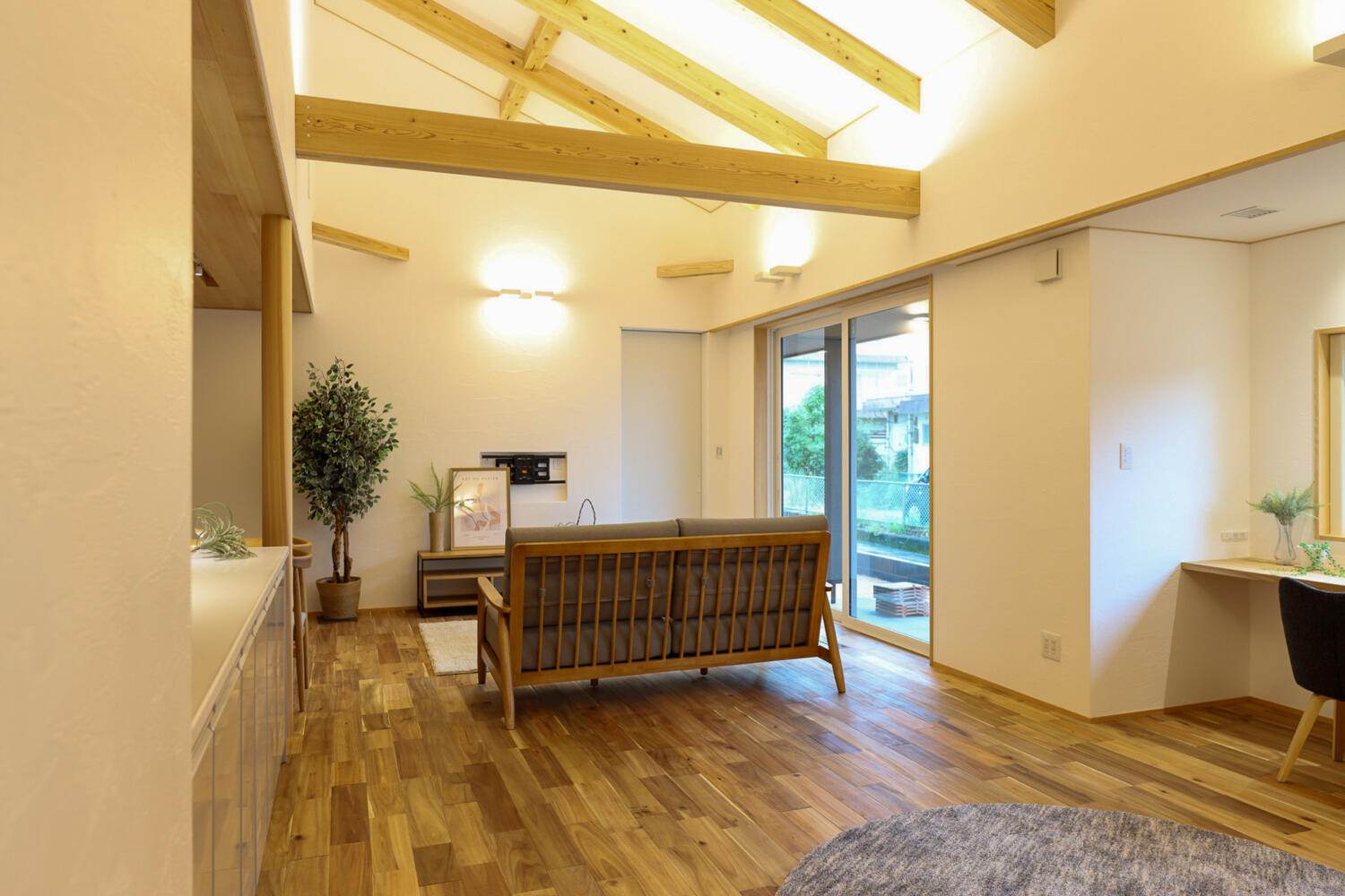 リビングとワークスペースがゆるやかにつながる空間には、自然素材の木をふんだんに使用し、