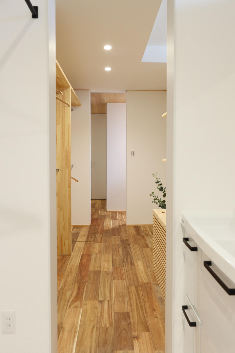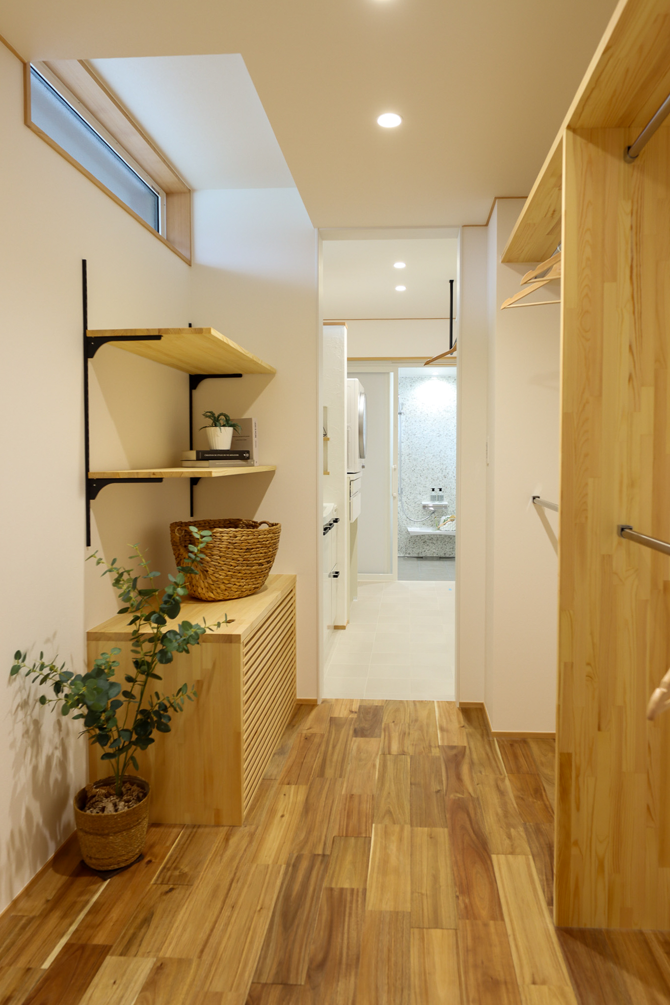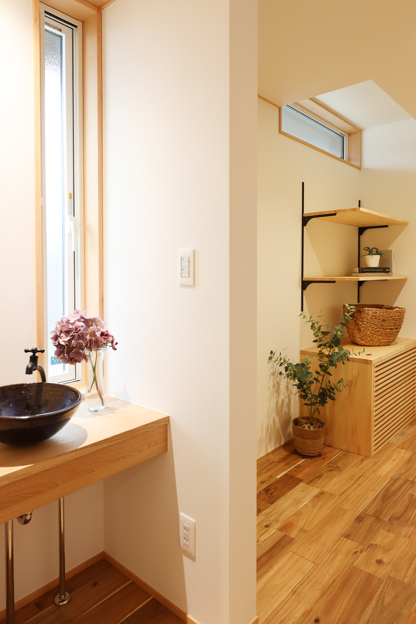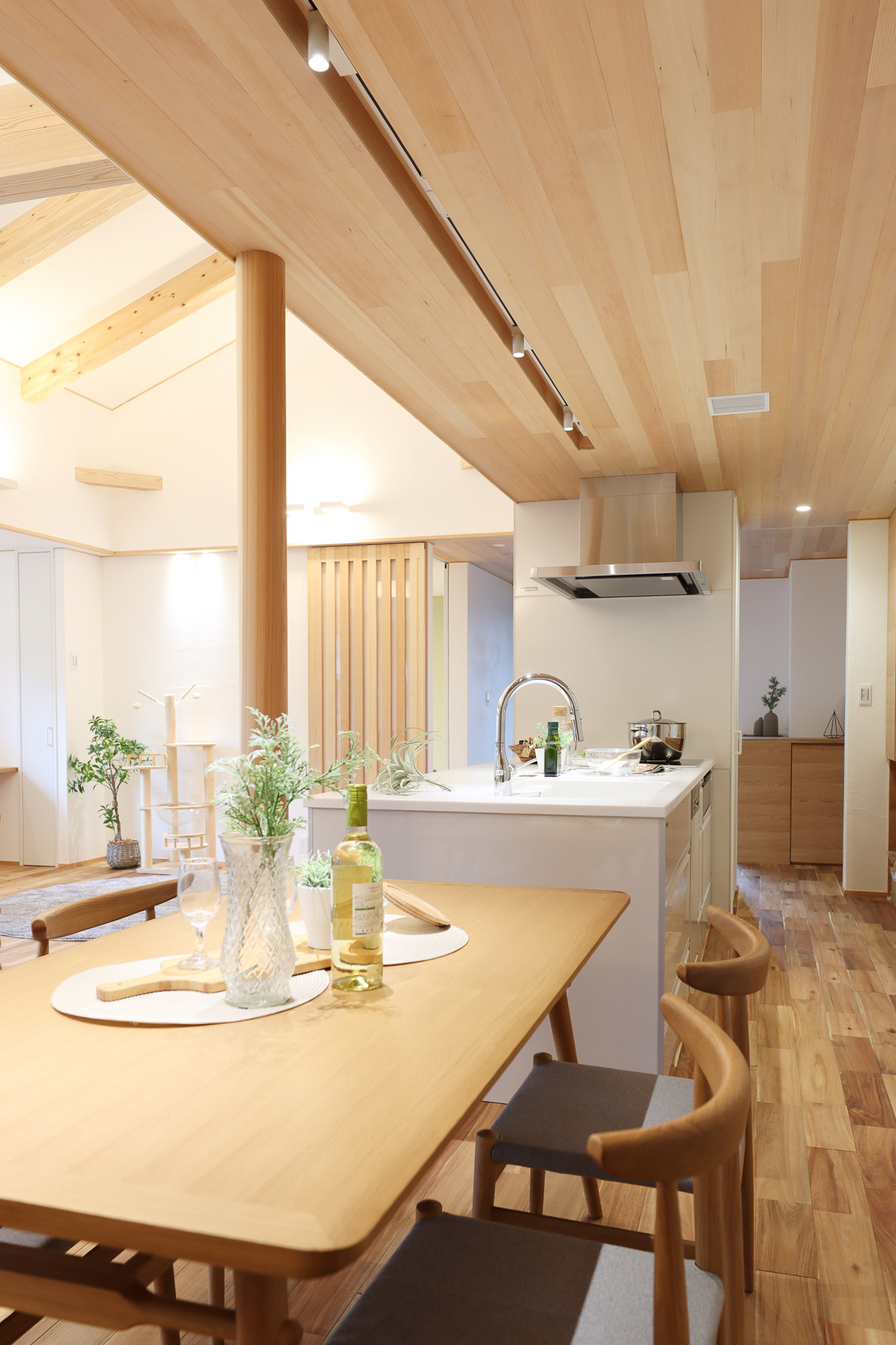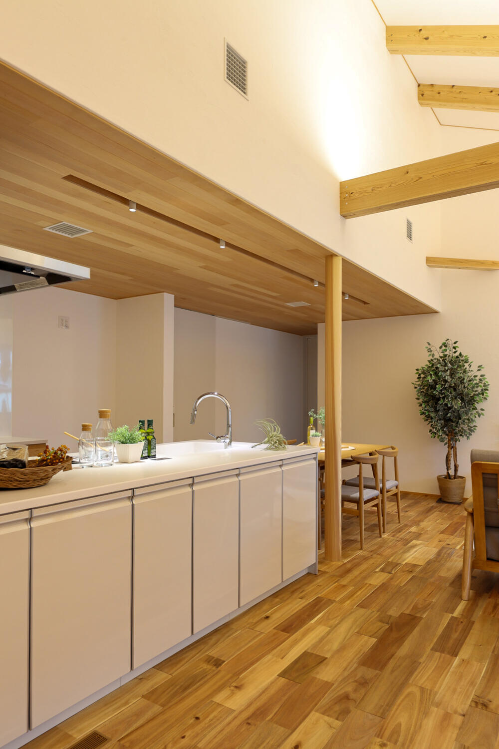 リビングとワークスペースがゆるやかにつながる空間には、自然素材の木をふんだんに使用し、