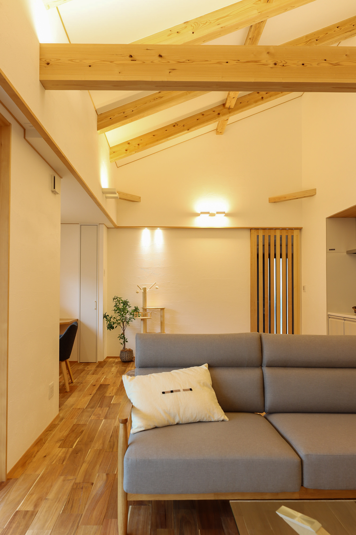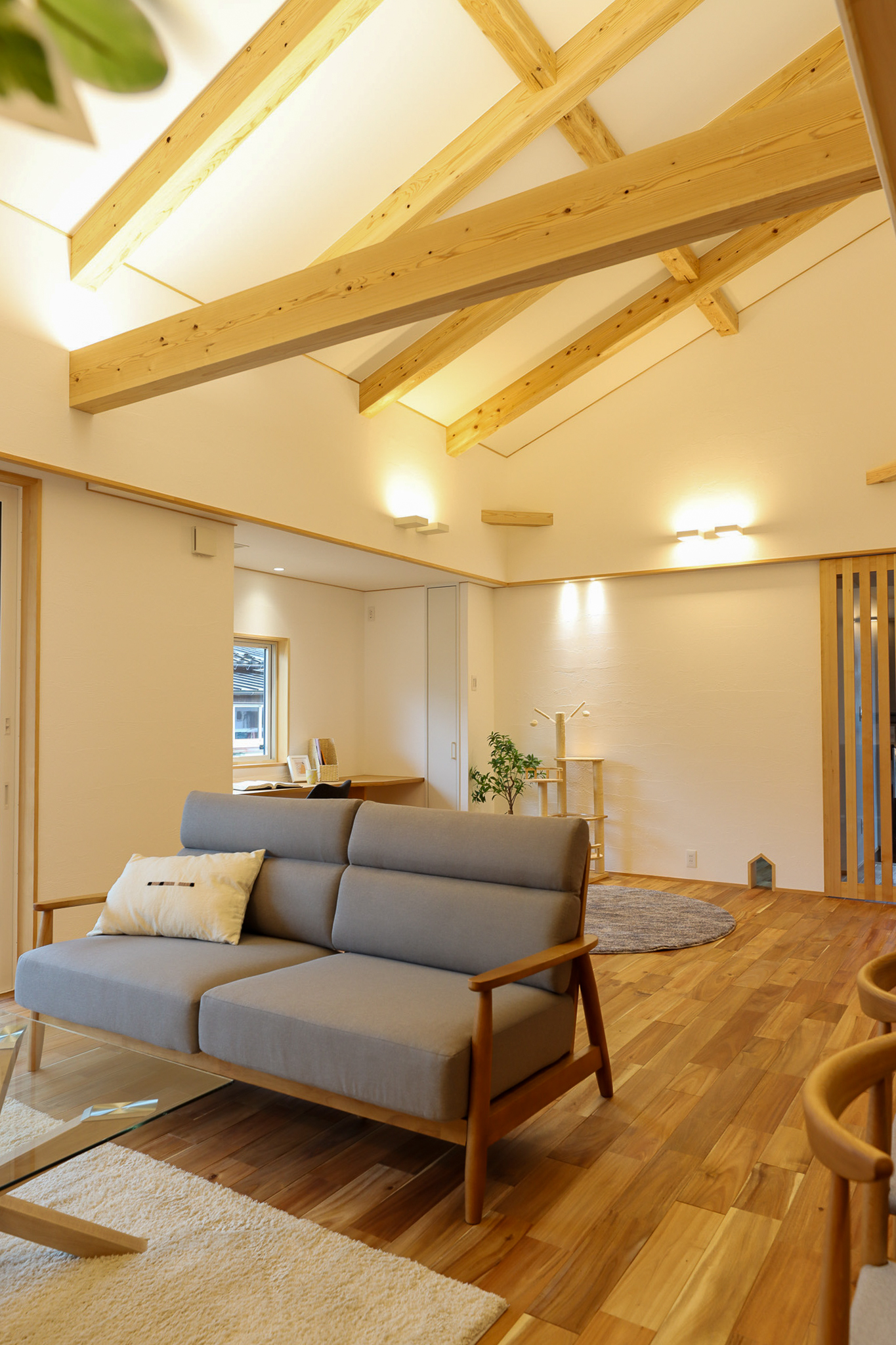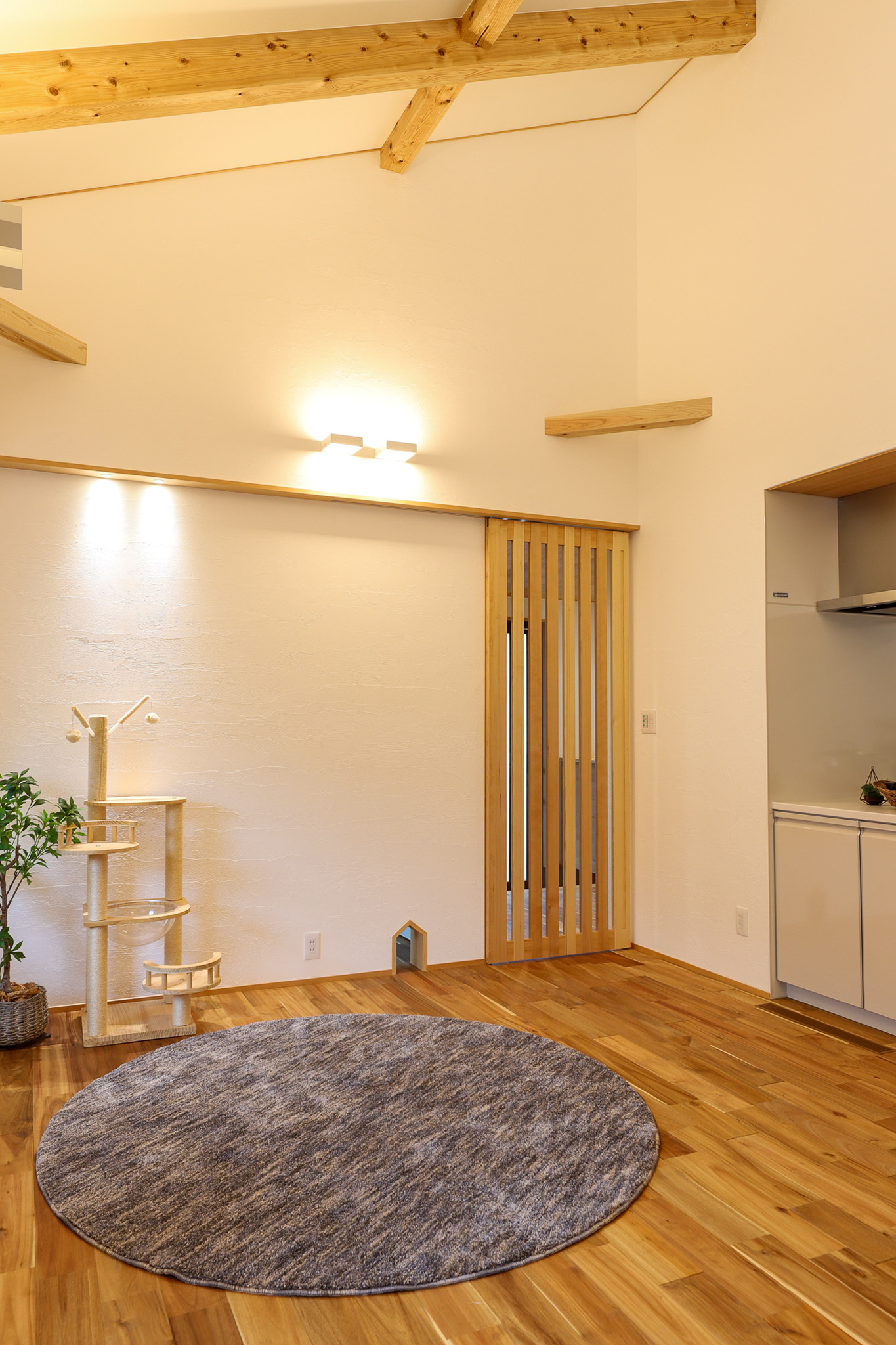 吹き抜けのある開放的な天井は、家族も猫もリラックスできる、のびやかな居心地を演出。