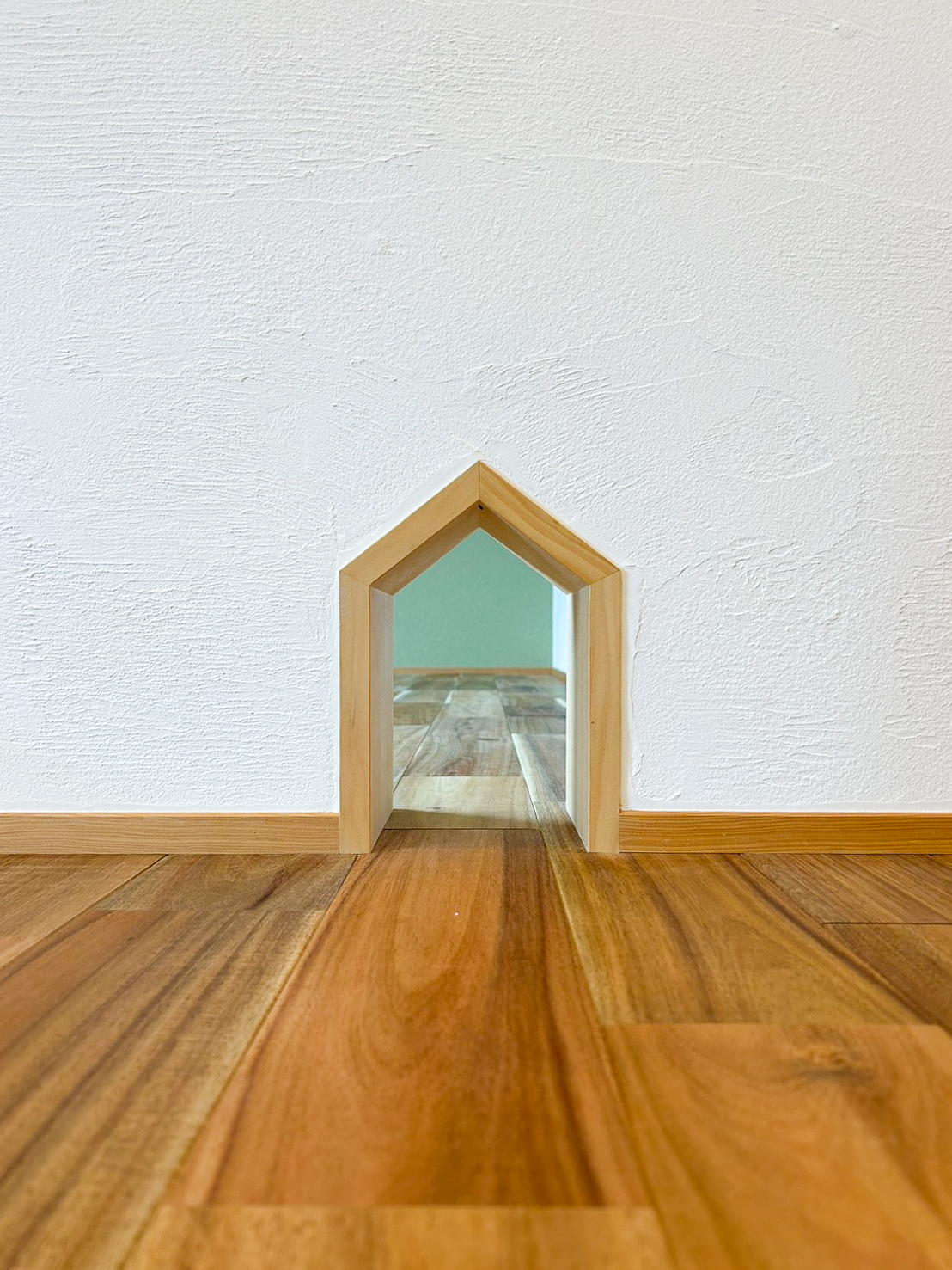 小さなトンネルをくぐり抜けて移動する猫の姿は、この家のささやかな癒やしの風景に。