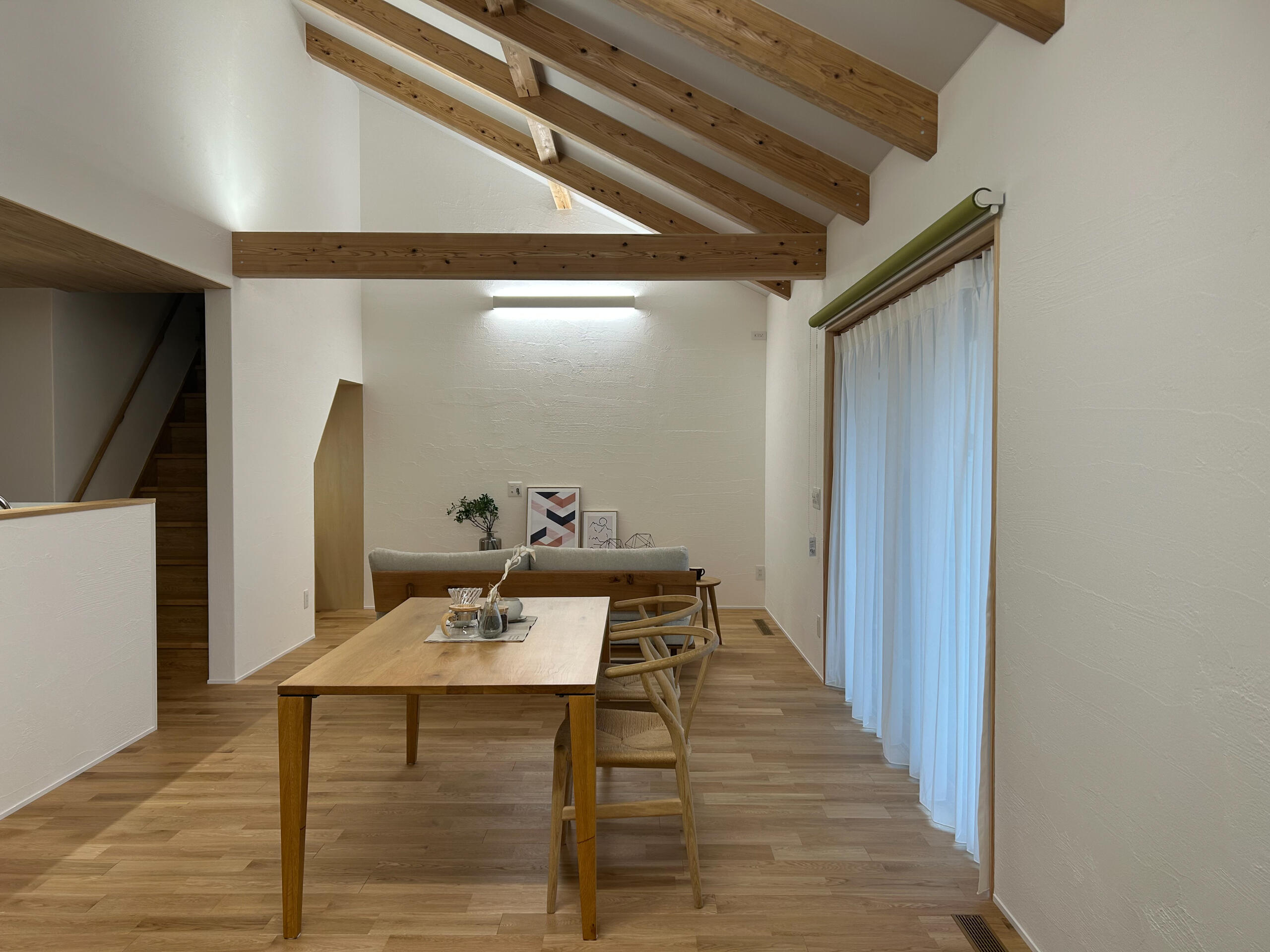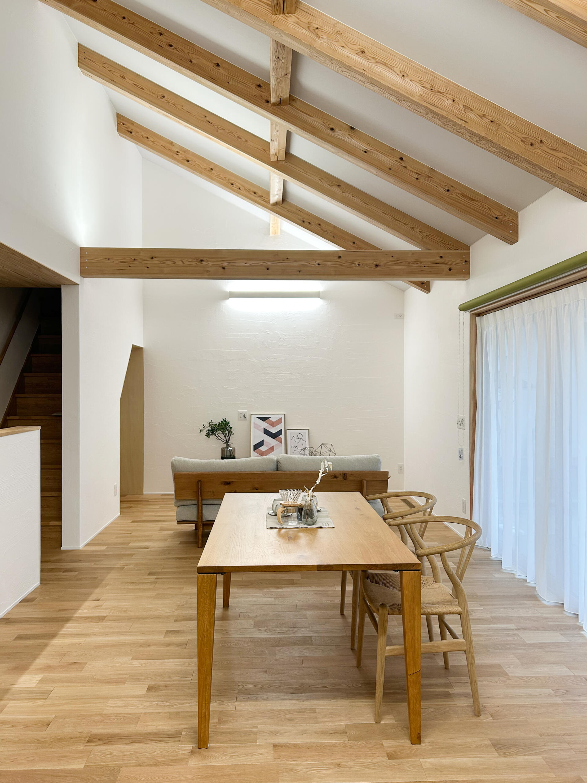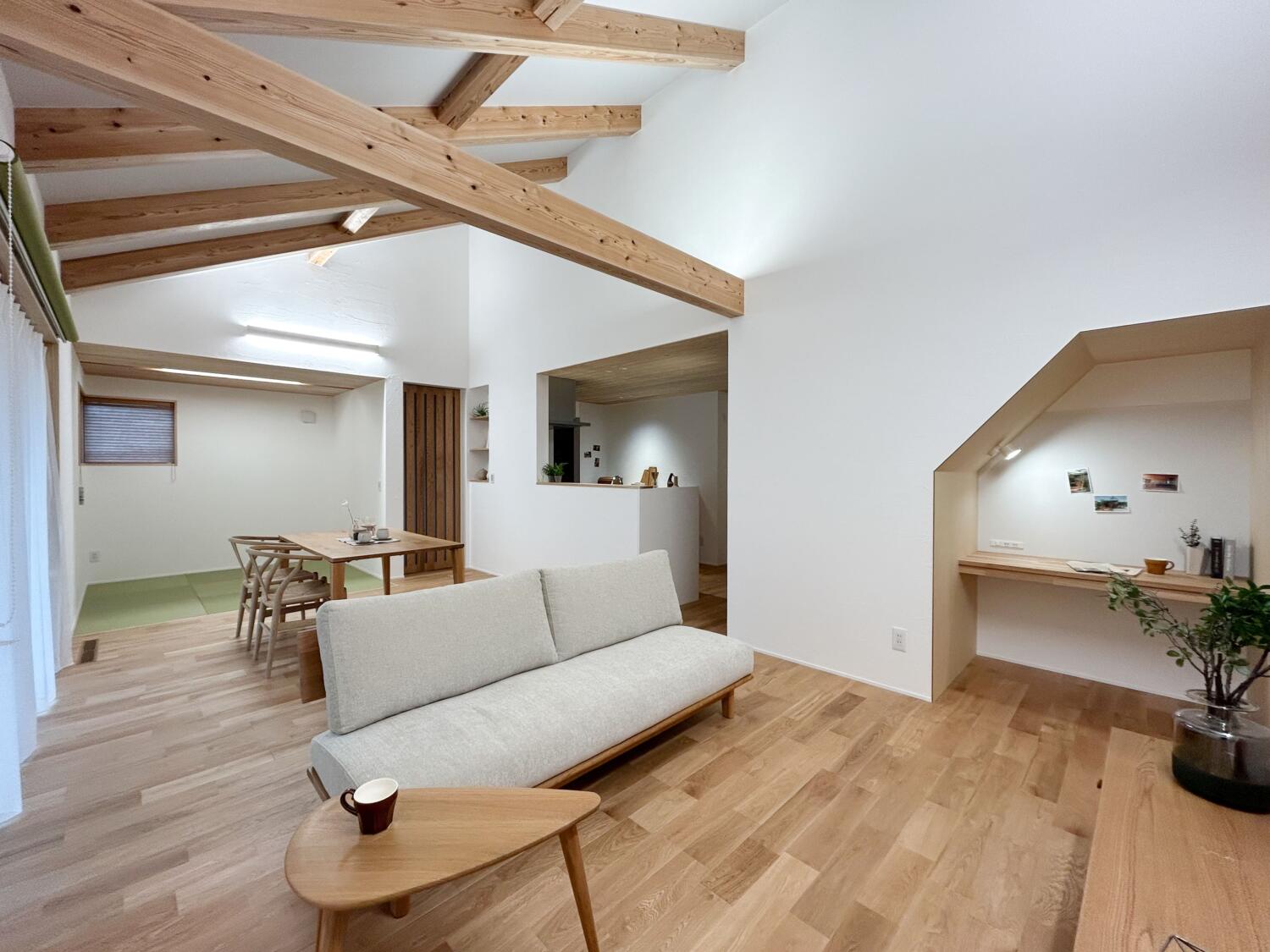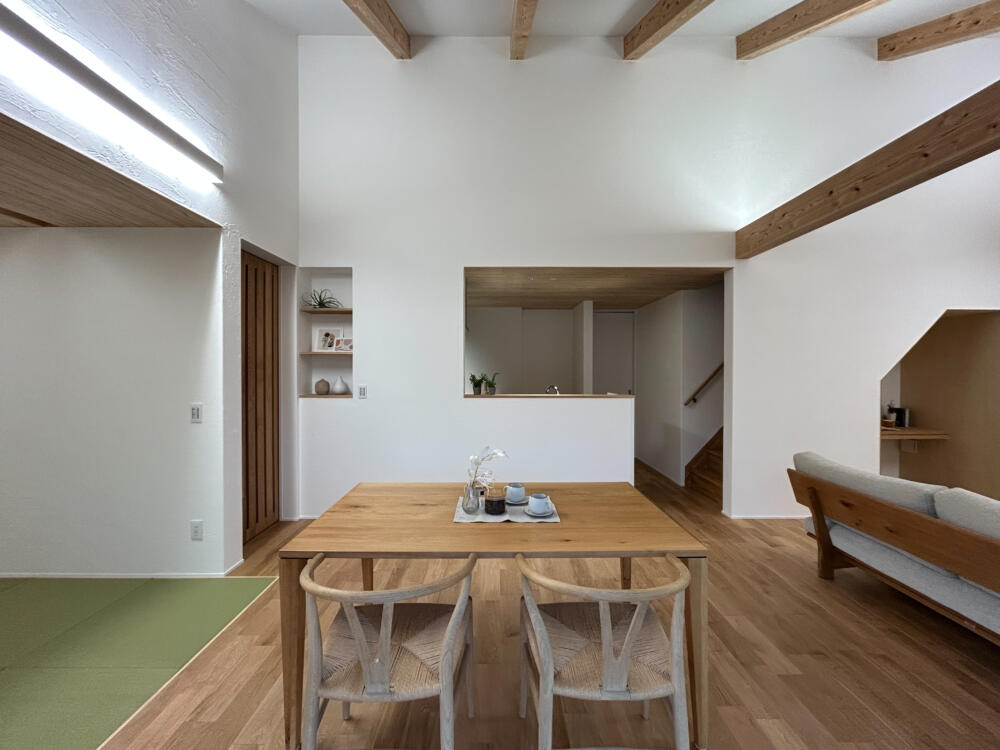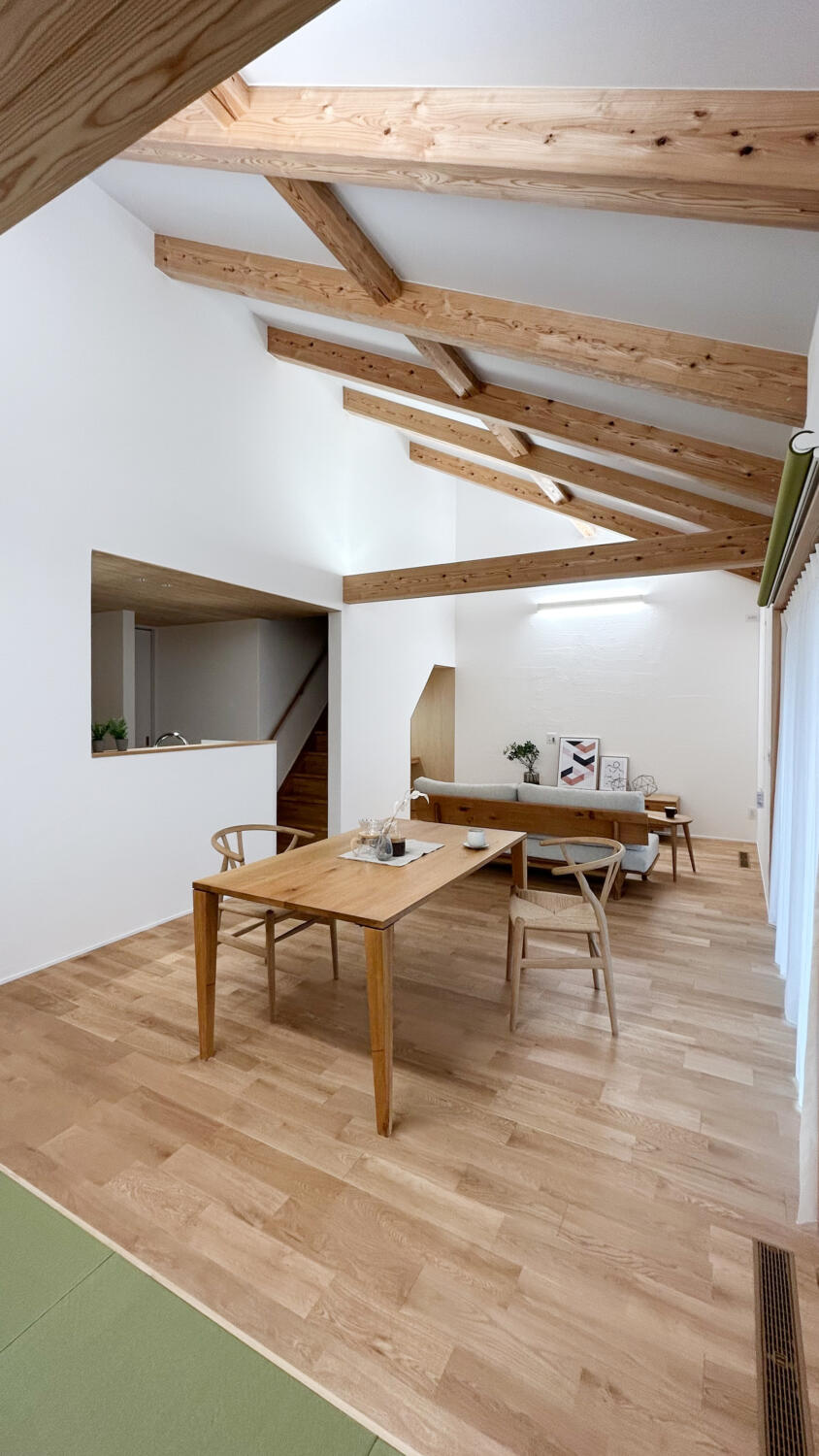 勾配天井に現しの梁をあしらい、縦への広がりを感じられる開放的なLDK。