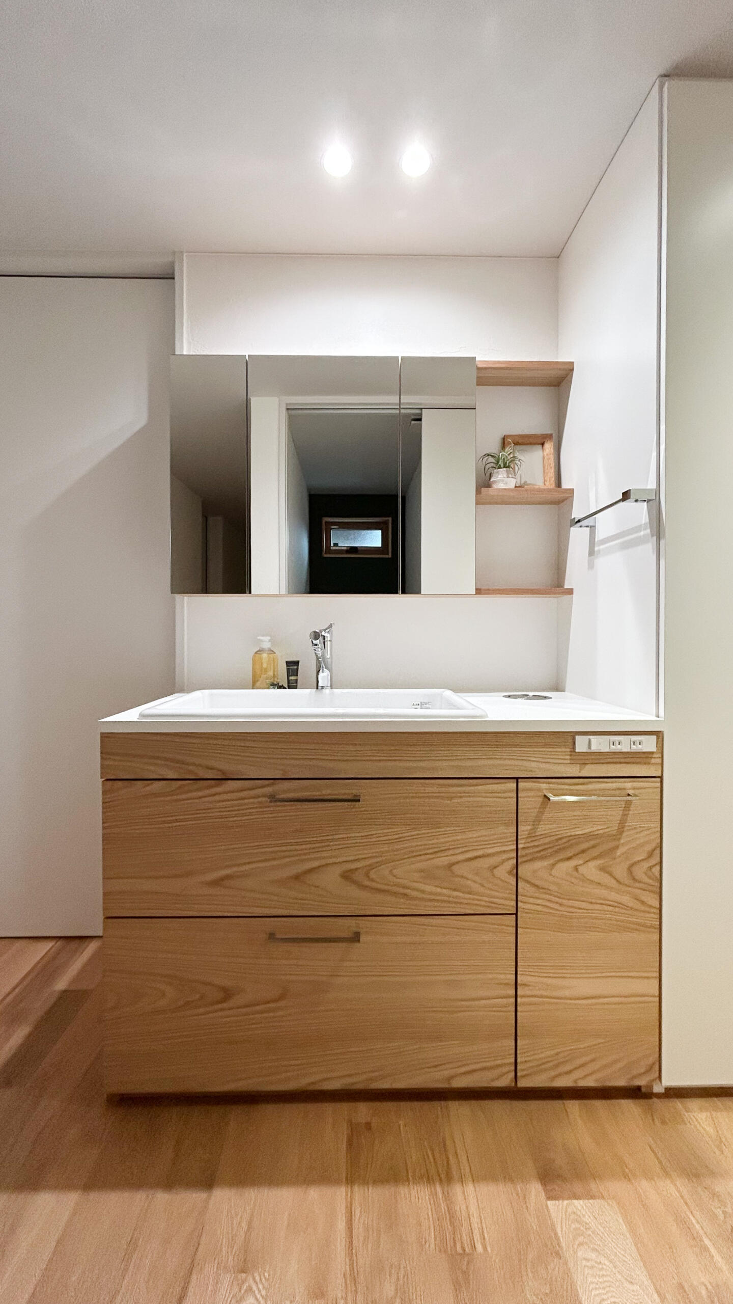 洗面台やカウンター、ニッチなどは空間に合わせて造作し、使い勝手とデザイン性を両立。