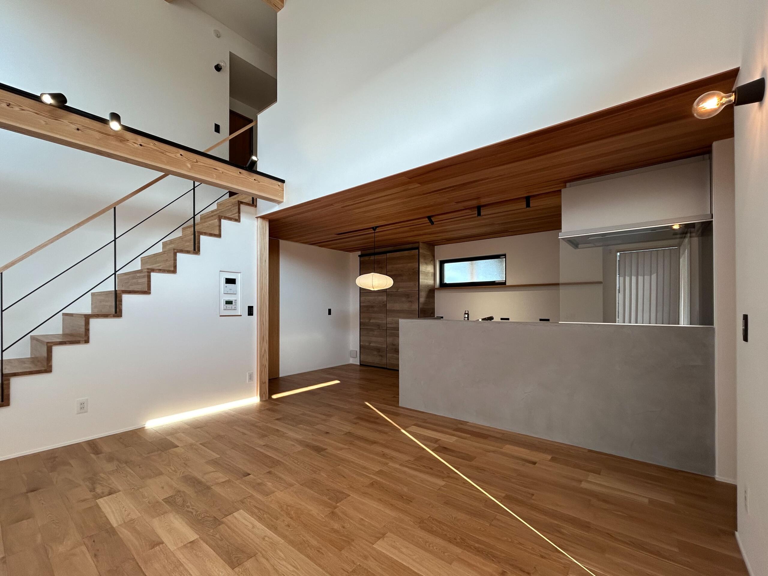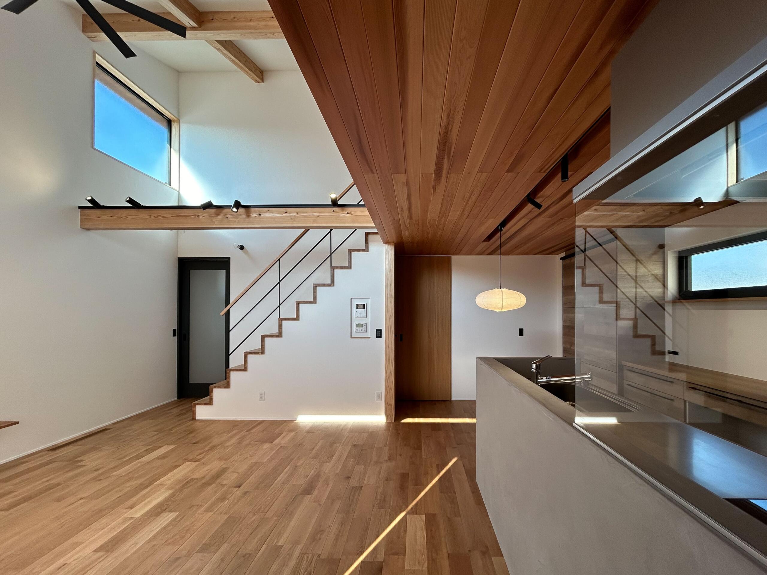 ダイニング・キッチンには木天井を採用し、リビングとは異なる落ち着きのある居心地を演出しています。