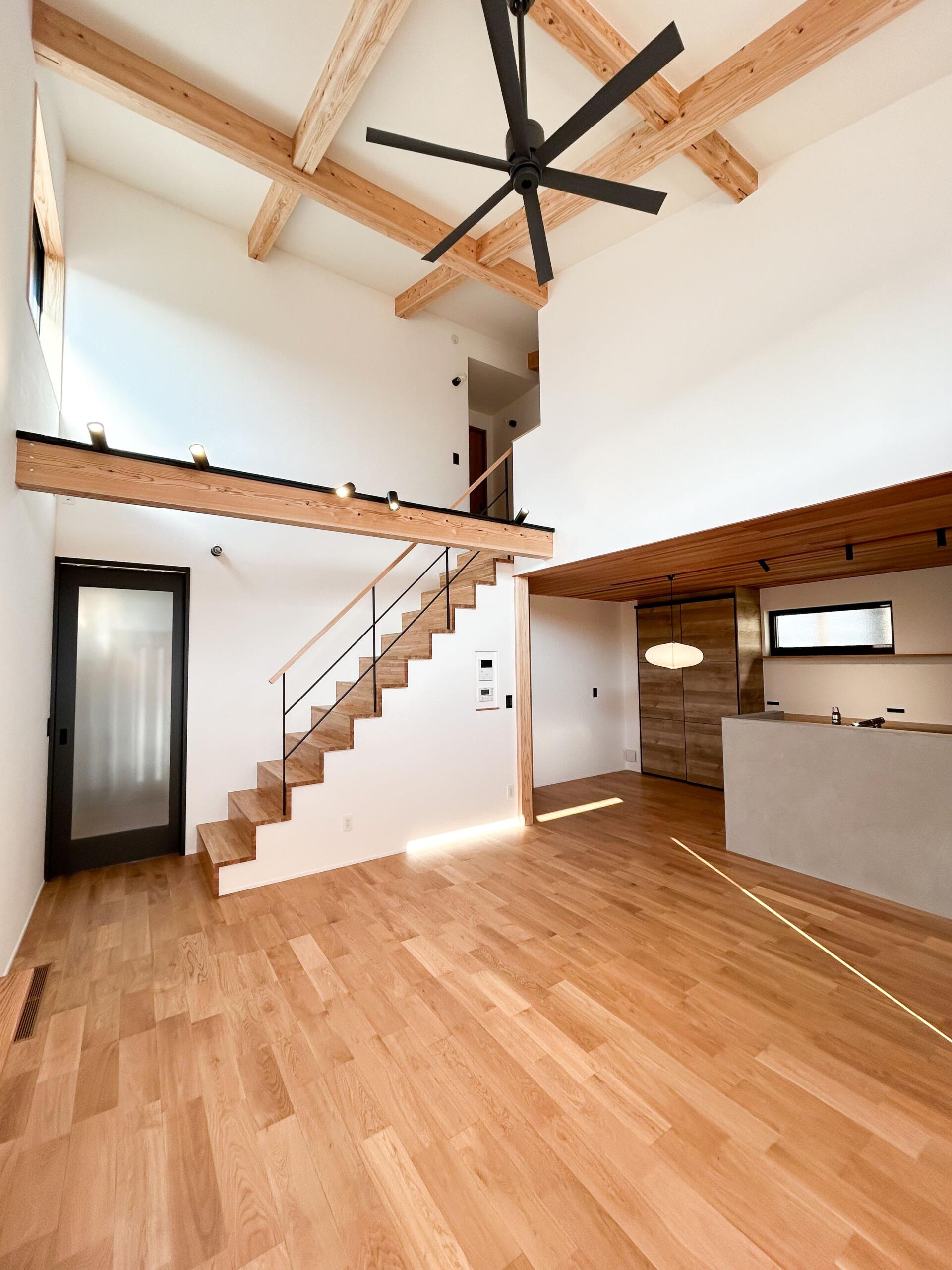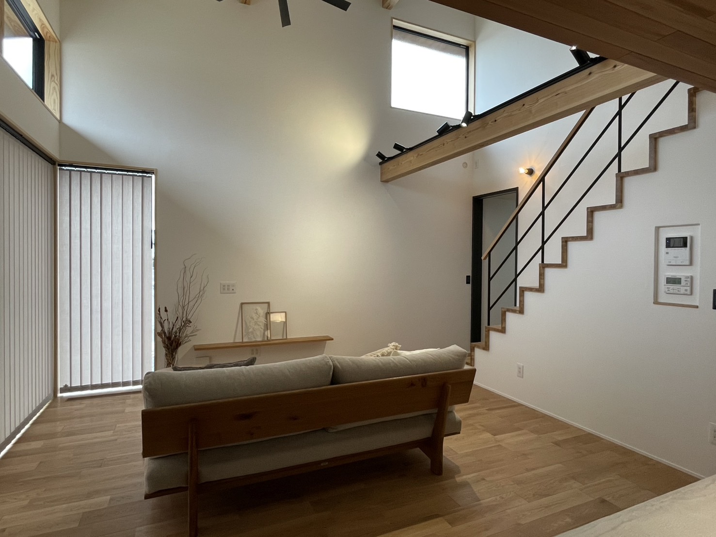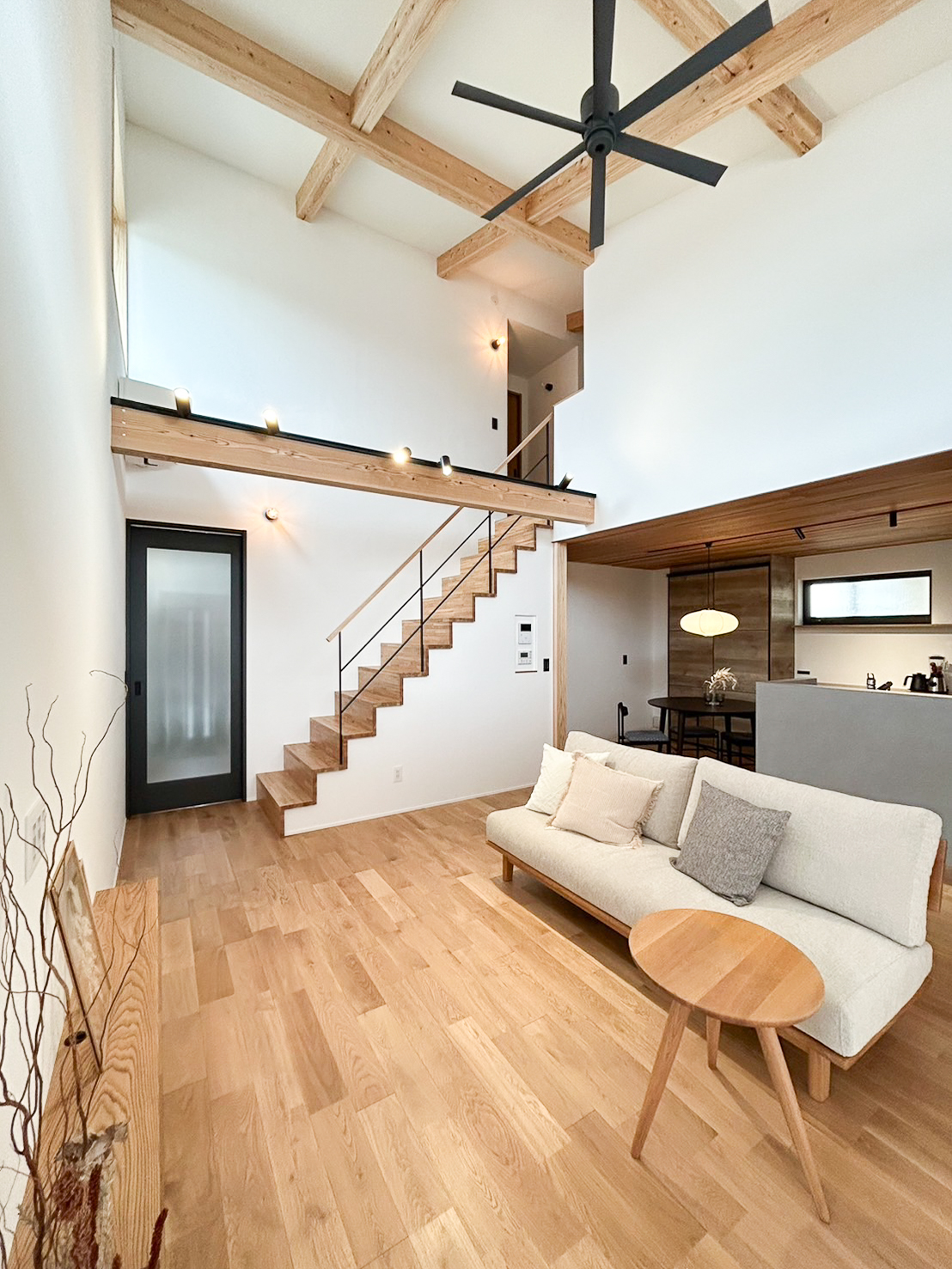 リビングには大きな吹き抜けを設け、上下階をゆるやかにつなぐことで、家全体に光と開放感をもたらしました。