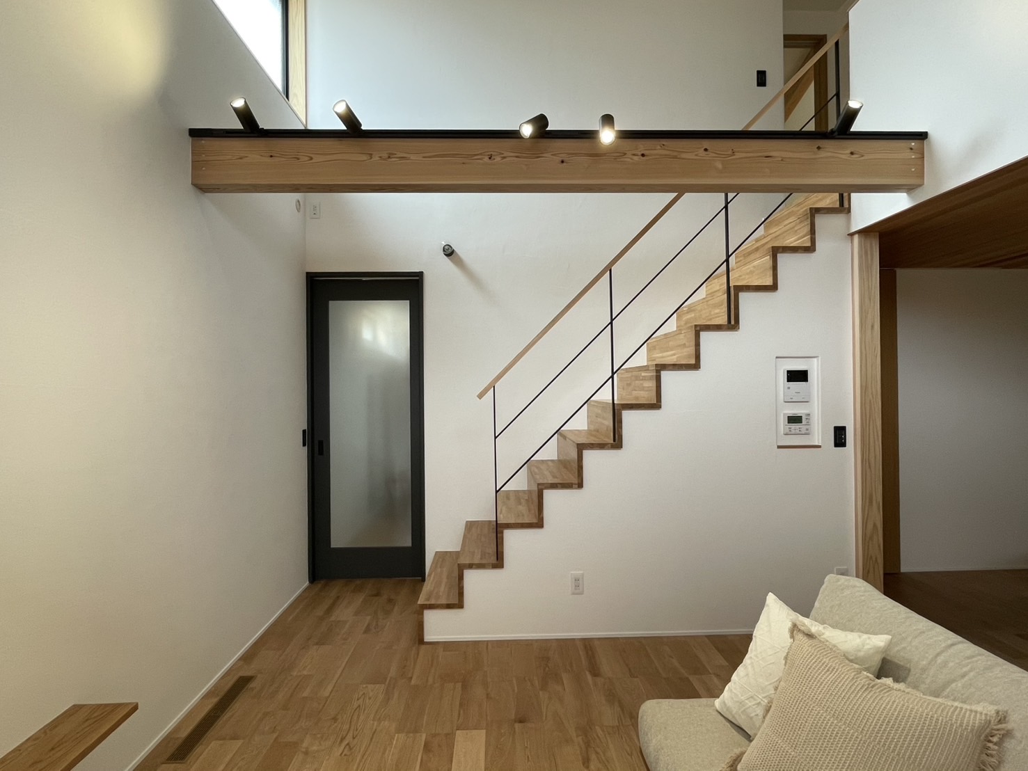 アイアン手摺が空間のアクセントとなり、シンプルながらも印象的なデザインに。